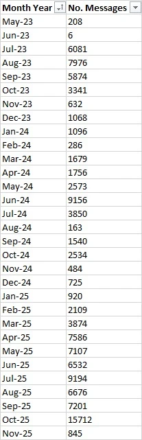 We respect the privacy of the members of the group chat. The backup that includes exact date, sender, and message is only available for the integrants of the group. The charts are made public for case study.